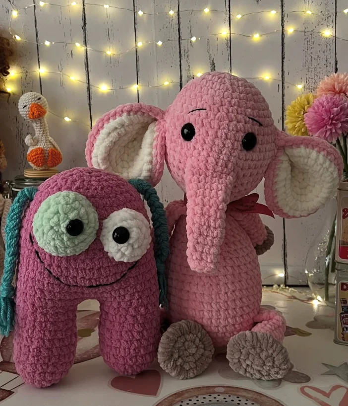 These adorable stuffed creatures feature a pink elephant with large ears and a quirky purple monster character, both crafted in soft, chunky yarn. Whimsical amigurumi like these appeal to both children and collectors, with handmade toys selling particularly well during holiday seasons.