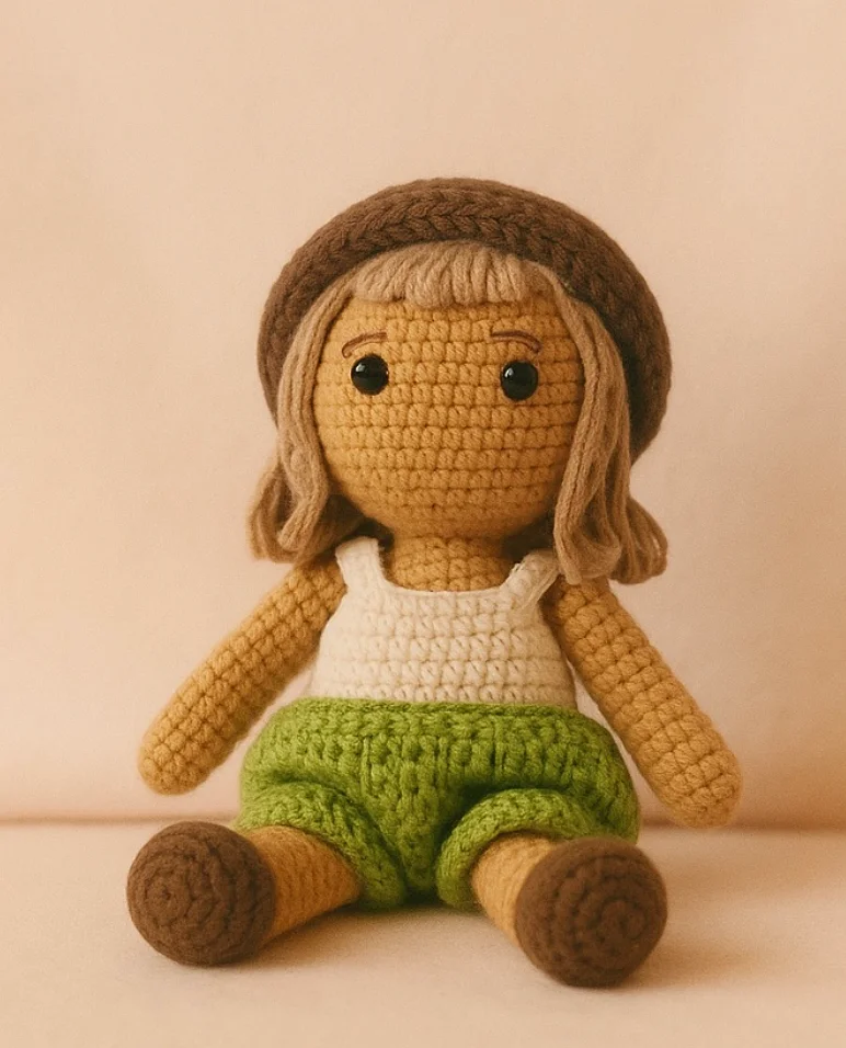 This charming amigurumi doll features a sweet design with blonde hair, a brown beret, and green pants paired with a white top. Perfect for children’s gifts or nursery decor, dolls like this showcase your skill in creating realistic features and clothing details.