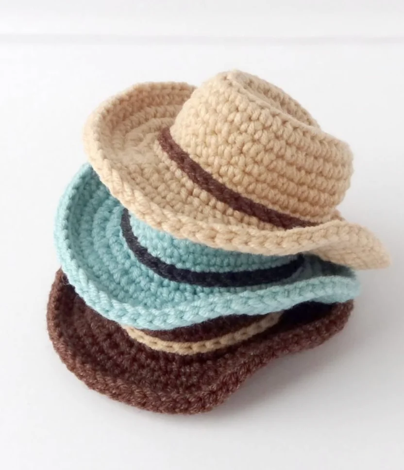 This stack of miniature crocheted cowboy hats in cream, turquoise, and brown showcases versatility in color and design. These accessories can be sold as doll accessories, ornaments, or photo props, offering multiple market opportunities.
